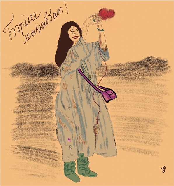 Открытка «Всем любви!». Из серии работ по переосмыслению исторической памяти. Оммаж на фото С. М. Дудина «Пряха». Автор: Гулим Амирханова