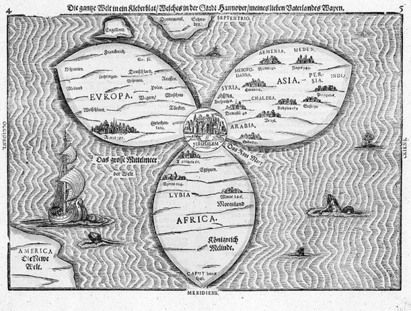 Mappa mundi Генриха Бюнтинга, известная как «Карта Бюнтинга в форме клеверного листа», символизирующая христианскую Троицу с городом Иерусалимом в центре мира. Из книги «Itinerarium Sacrae Scripturae» (Магдебург, 1581)