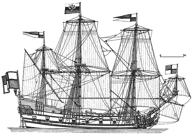 Еще перед началом постройки корабля его создатели прояснили крайне важный момент – какой флаг должен быть поднят на нем. Капитан Давид Бутлер даже специально разъяснил в письме царю, что «какого государства корабль, такое и знамя на нём живёт». В итоге на пошив флага и «еловчиков» (вымпелов) была отпущена красная, белая и синяя материи. Таким образом, именно в подмосковном селе Дединово впервые взмыл вверх российский триколор – он же кормовой флаг первого русского корабля. Достоверно неясно, каким именно был рисунок этого флага. Известно лишь, что 24 апреля 1669‐го царским указом было велено «на знаменах и еловчиках нашивать орлы же», т. е., скорее всего, на корабле развевался трехцветный флаг с нашитым сверху двуглавым орлом.