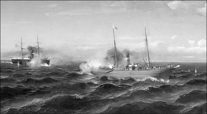 Русский пароход «Веста» ведет бой с турецким броненосным корветом «Фетхи-Буленд»