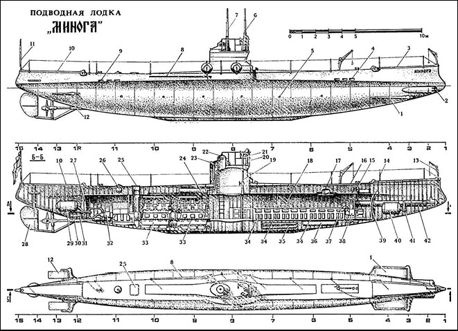 При этом Бубнов предложил Морскому техническому комитету сразу строить два проекта новых субмарин – «малый» и «большой». Малая подводная лодка должна была иметь водоизмещение 117 тонн и два носовых торпедных аппарата, а большая – 360 тонн и четыре торпедных аппарата. В дальнейшем предполагалось, что русские субмарины будут делиться на «прибрежные», водоизмещением около 100 тонн, и «крейсерские», водоизмещением от 300 до 400 тонн. Балтийский завод получил заказ на постройку 9 февраля 1906 г., а лодкам были присвоены наименования: малая стала «Миногой», а большая – «Акулой». Но приоритет по времени оказался все-таки у «Миноги», именно она стала первой русской дизельной подводной лодкой.