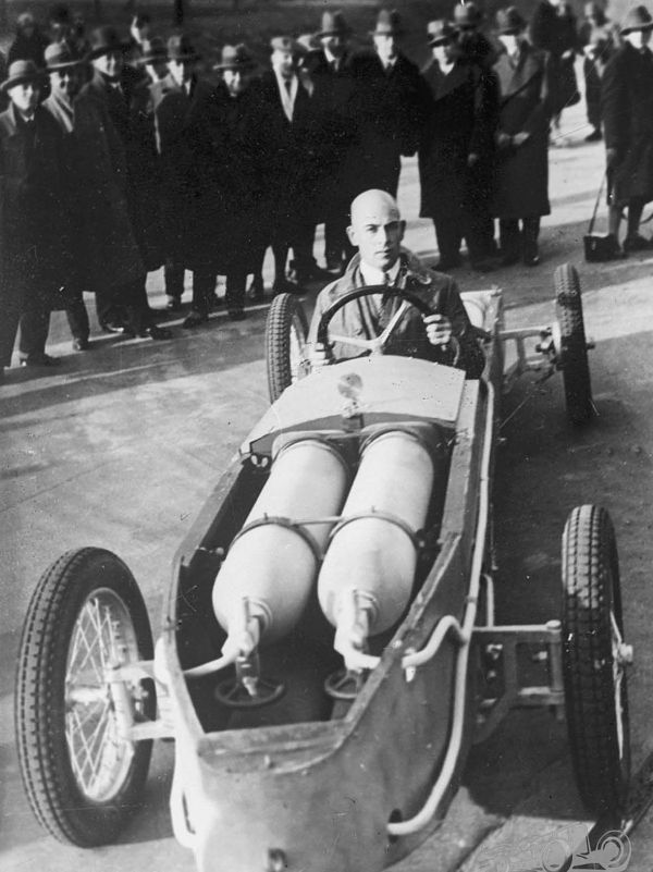 Макс Валье за рулем своей экспериментальной ракетной машины