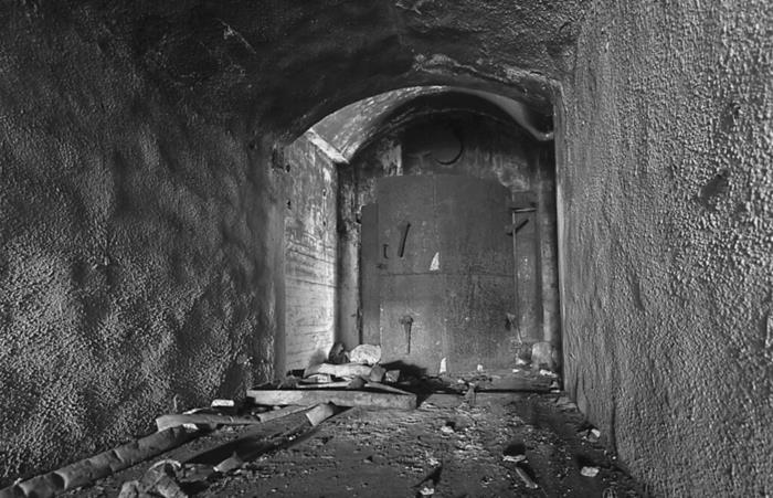 Дальше коридор метра три длиной, справа – помещение охраны, за ним еще одна дверь, по типу переборок, как в отсеках подводных лодок. Кроме того, есть и казарменное помещение с остатками ржавых кроватей. В одном из них, скорее всего, был командный пункт или центр связи, поскольку видны обрывки проводов. Чуть ниже – генераторный отсек с емкостями для топлива, литров на четыреста. Плюс ответвления к боковым пулеметным казематам. Гарнизон бункера предположительно составлял 30–40 человек.