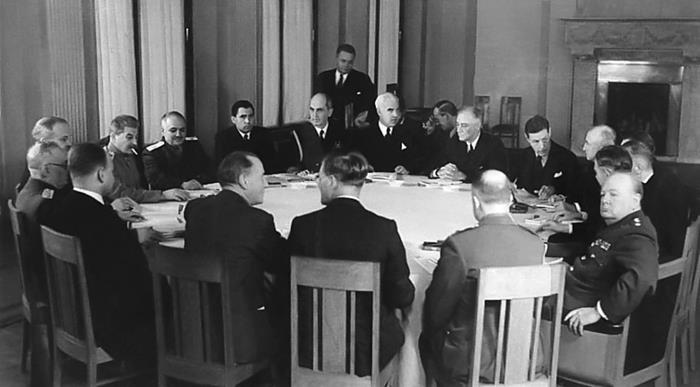 Лидеры «Большой тройки» за столом переговоров на Ялтинской конференции. 1945 г.