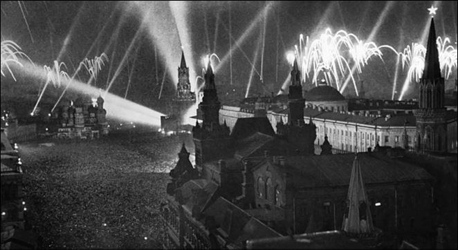 «В ночь на 9 мая 1945 года москвичи не спали, – свидетельствовал военкор Александр Устинов. – В 2 часа ночи по радио объявили, что будет передано важное сообщение. В 2 часа 10 минут диктор Юрий Левитан прочитал Акт о военной капитуляции фашистской Германии и Указ Президиума Верховного Совета СССР об объявлении 9 мая Днем всенародного торжества – Праздником Победы. Взяв фотоаппарат, я вышел на улицу…
