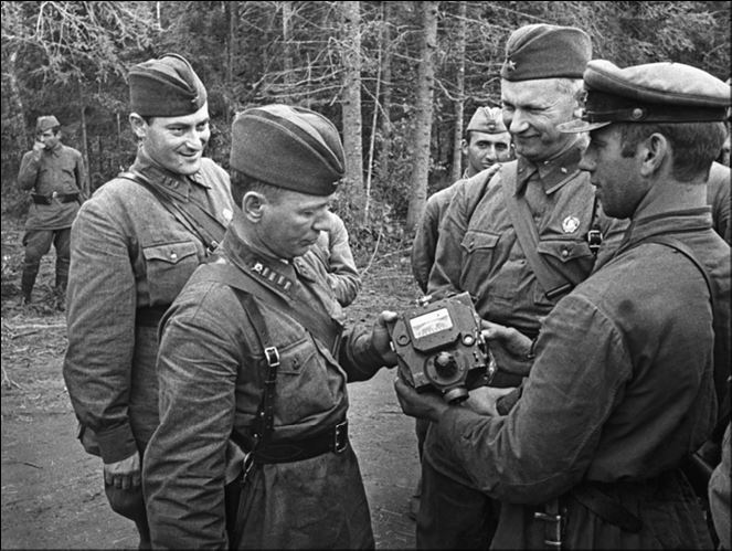 Советские военные корреспонденты Михаил Шолохов (на переднем плане слева) Евгений Петров и Александр Фадеев (на втором плане слева направо) на фронте