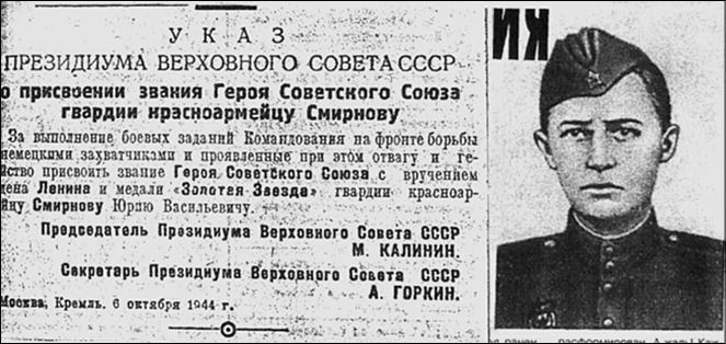 Оршу освободили 27 июня, а 6 октября 1944‐го Юрию Васильевичу Смирнову посмертно было присвоено звание Героя Советского Союза (прежде солдата наградили орденом Отечественной войны 1‐й степени – приказ 8 гв. СК № 59/н от 05.08.1944). При этом в наградном представлении, подписанном командиром полка 21 августа 1944 г., по какому-то недоразумению воинское звание Смирнова было указано неверно: «гв. красноармеец». Ошибку исправили только тридцать четыре года спустя.