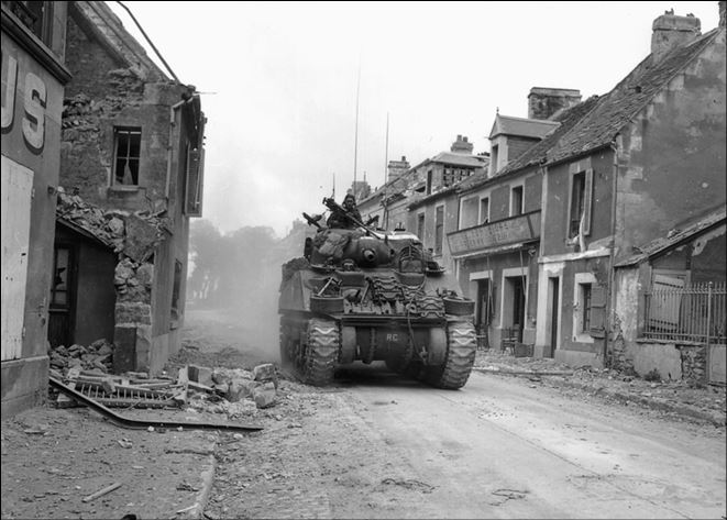 Танки союзников движутся по улице французского города Кан в Нижней Нормандии. Июль 1944 г.