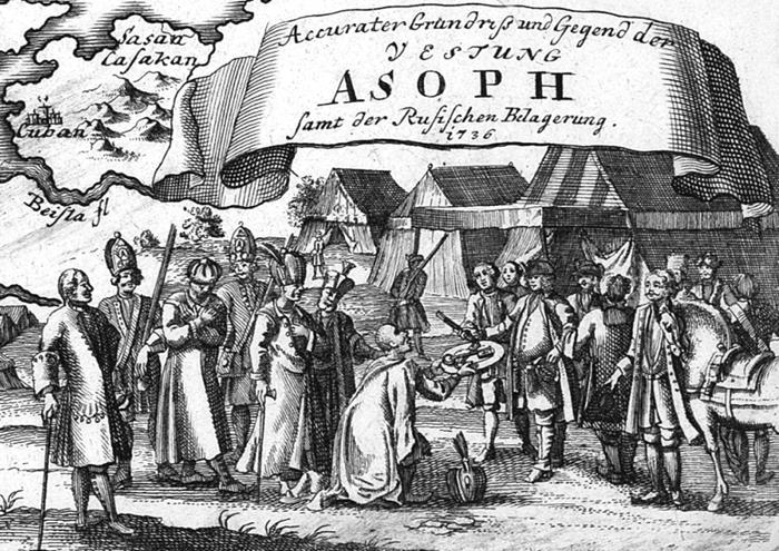 Капитуляция Азова в 1736 году. Азовский паша Мустафа Ага вручает ключи от города фельдмаршалу графу Ласси. С гравюры 1740 г.