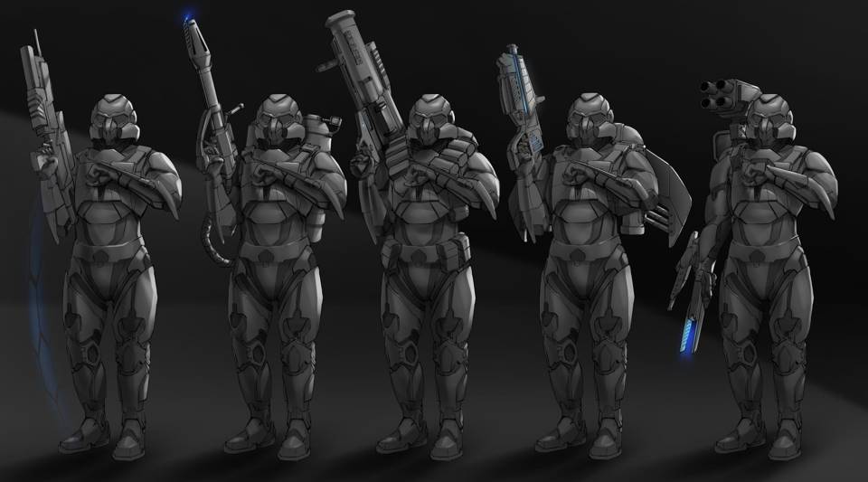 А во-вторых, все представленные модели отличались дополнительным «обвесом». К примеру, модель под гранатомет имела специальные отсеки и клапаны для зарядов, на другой имелась та самая пусковая установка под четыре небольшие ракеты, которую возжелал себе Куча. Еще была модель с прыжковым ранцем, модель брони, заточенная под ближний бой, и так далее.