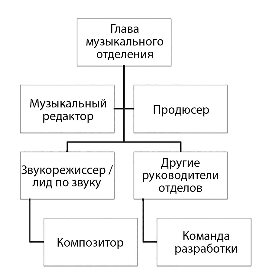 Рис. 8.1. Иерархия студии применительно к музыкальному направлению. Схема показывает иерархию разработчиков звуковой части и их менеджмент. Подробная информация о других руководителях команды и ее структуре (включая другие подразделения) приведена на рис. 8.2