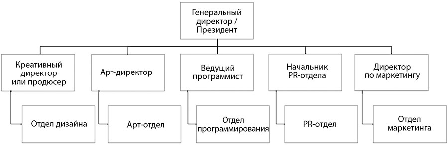 Рис. 8.2. Стандартная структура команды в игровой индустрии. На рисунке показаны традиционные отделы по разработке и их руководство. Отдел по производству звукового контента см. на рис. 8.1