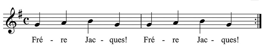 Точное совпадение нот в начале и в конце цикла по высоте и инструментовке может решить эту проблему, но зачастую создает несколько новых. Давайте рассмотрим ситуацию на примере еще одной детской песенки – «Братец Жак». Совершенно очевидно, что первое звучание «Братец Жак» заканчивается на той же ноте, на которой начинается второе повторение. Если трек заканчивается после первого «Братец Жак», а затем начинается со второго, склейка будет представлена двумя одинаковыми нотами.