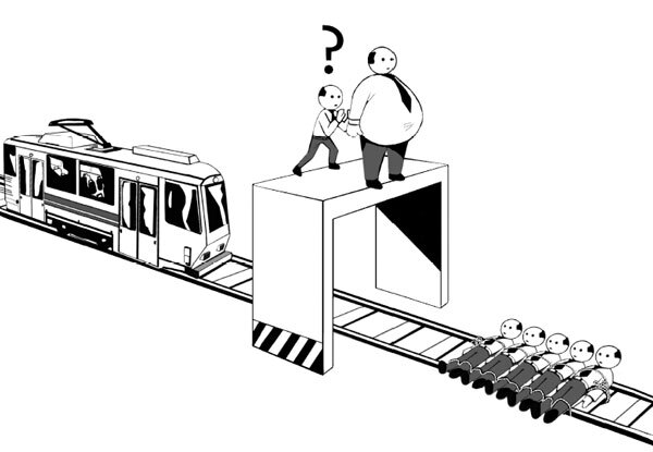 Если в первом случае 80 % опрошенных считали, что перевести стрелку – допустимое решение, то во втором те же 80 % не решались сбросить толстяка, позволяя вагонетке раздавить пятерых.