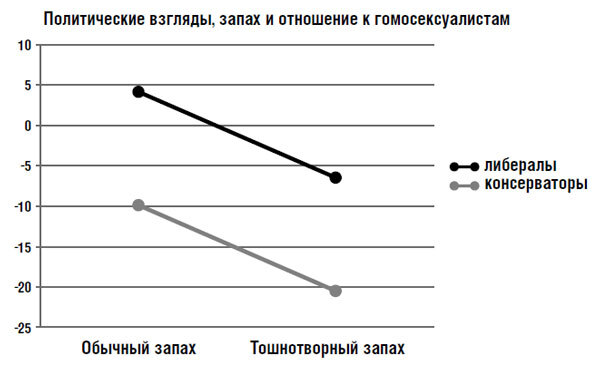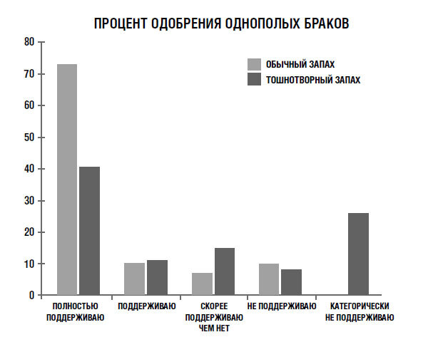 Одним из таких исследований и стал эксперимент Инбаро и Писарро. В нем ученые решили проанализировать, как чувство физического отвращения влияет на моральные оценки консерваторов и либералов в социально чувствительных вопросах. Для этого исследователи пригласили группы по 60 человек в небольшую комнату, где просили оценить уровень симпатии/антипатии к геям, лесбиянкам, афроамериканцам и пожилым людям. После этого в помещении распылили жидкость с тошнотворным запахом и эксперимент повторили. Результаты произвели эффект разорвавшейся бомбы. Отвратительный запах не повлиял на отношение к пожилым и афроамериканцам, а вот взгляды на лесбиянок и геев подверглись коррекции в сторону большего осуждения. Но если охлаждение в отношении к лесбиянкам наблюдалось больше у мужчин и не было статистически значимым, то падение симпатии к геям было ярко выраженным у всех групп, включая либерально настроенных.
