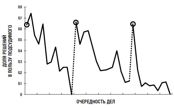 Исследование строилось на анализе 1112 судебных постановлений, собранных за 50 дней работы восьми израильских судей. Их работа заключалась в том, чтобы рассматривать прошения об условно-досрочном освобождении из четырех главных тюрем Израиля. Ученые проанализировали вынесенные решения и их распределение по времени в течение рабочего дня. Итоги были поразительны! Оказалось, что на послеобеденное время приходится максимальное количество положительных резолюций.