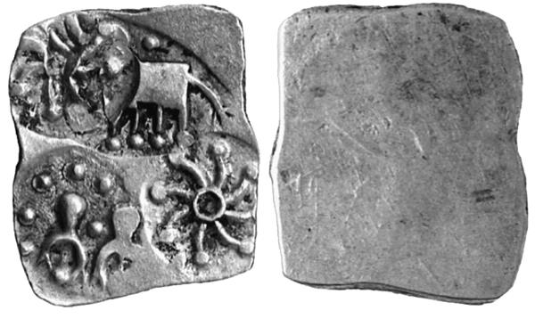 В статье «Монеты Индии» на сайте «ЗнакМастер» отмечается, что древние денежные знаки Индии значительно отличались от первых монет Лидии, Ионии, Греции. Они вырезались из куска листового чистого серебра, затем обрезались до необходимого веса, приобретая формы квадратов, прямоугольников, кругов или близкие к этим. На самых ранних монетах Индии только с одной стороны штамповались определенные символы, например (очень часто) от одного до шести изображений солнца с шестью радиально расходящимися лучами, или другие простые изображения. На монетах более позднего периода рисунок чеканился уже с обеих сторон. Скорее всего, данные штампы служили гарантией веса и чистоты металла от монетного двора.
