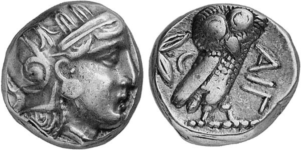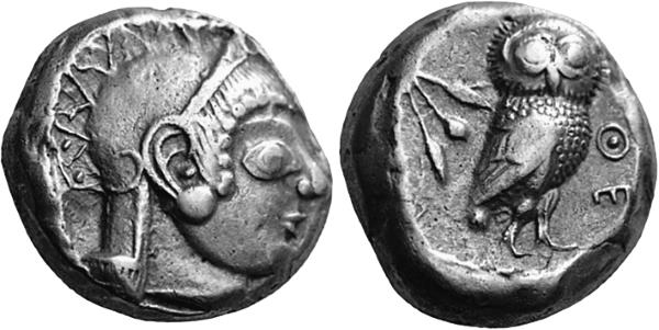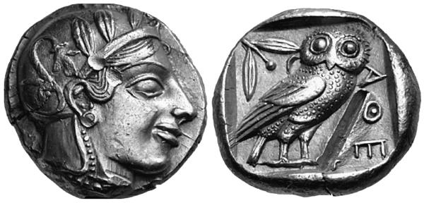 Тетрадрахма, классический стиль. Аттика, Афины, ок. 454–404 гг. до н. э. Серебро (17,19 г, 22 мм). Аукцион «Classical Numismatic Group», 2014 г. $ 900