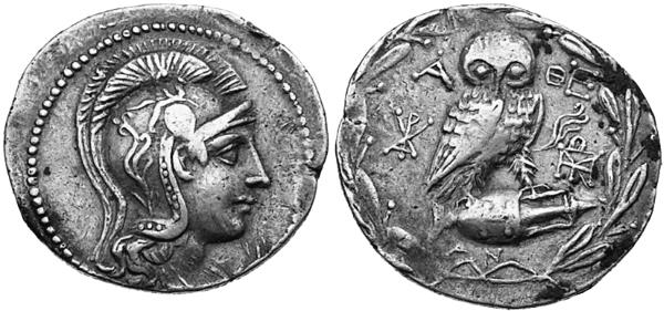 Тетрадрахма, новый стиль. Аттика, Афины, около 165 г. до н. э. Серебро (16,68 г). Аукцион «Ira & Larry Goldberg», США, 2018 г. $ 330