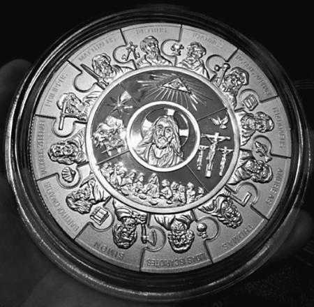 В общем, без лишних слов: самой красивой монетой я считаю выпуск Республики Либерия 2007 года «12 апостолов» («Апостольский талер»), выполненный в серебре 999-й пробы с позолотой (существует вариант из чистого золота, но его вид не так сильно впечатляет). Чеканку шедевра осуществил хорошо известный читателям этой книги монетный двор «B.H. Mayer᾽s Kunstprageanstalt GmbH».