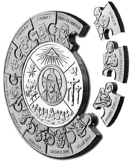 По краю монеты, окружая Иисуса, изображены на монетках-пазлах 12 апостолов с указанием их имён: «SIMON» (Симон Зилот), «BARTHOLOMAEUS» (Варфоломей), «IACOBUS ZEBEDAEI» (Иаков Зеведеев), «PHILIPPUS» (Филипп), «MATTHAEUS» (Матфей), «PETRUS» (Пётр), «IOANNES» (Иоанн Богослов), «IACOBUS ALPHAEI» (Иаков Алфеев), «THADDAEUS» (Фаддей), «ANDREAS» (Андрей), «THOMAS» (Фома) и «IUDAS ISCARIOTES» (Иуда Искариот).