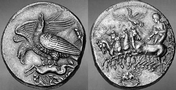2-е место. Декадрахма 409–406 годов до н. э. Акрагант, Сицилия. Серебро, вес 42,42 г. Аукцион «Numismatica Ars Classica» (Цюрих). Продана в 2012 году за 2 300 000 швейцарских франков (то есть в июле 2021 оценка монеты около 185 000 000 рублей).