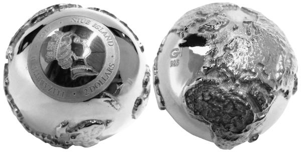 3-е место. 2 новозеландских доллара. «Золотой глобус с бриллиантом». Ниуэ, 2017 год. Отчеканены в 3D на предприятии «Helvetic Mint» (Швейцария). Первая монета в форме глобуса с топографическим рельефом континентов. Выполнена из серебра 925-й пробы с золочением. Особенностью является вставка из белого бриллианта, который устанавливается в месте, указанном заказчиком (можно обозначить любую столицу мира).