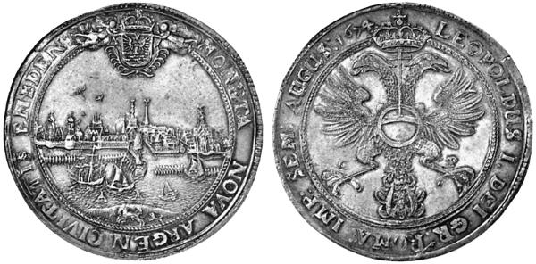 5-е место. 2 талера. Город Эмден, 1674 год. Изготовлены в эпоху Леопольда I (1640–1705). Аверс с видом на Эмден действительно впечатляет. На суше на переднем плане скачут кони. Во внешней гавани плывут корабли, которые заходят в защищённые воды внутренней гавани. За стеной многочисленные городские шпили поднимаются в безоблачное небо, где парят птицы. Великолепная картина XVII века! Монета отчеканена в серебре, на аукционе монет Всемирного наследия в 2014 году реализована за 95 тысяч долларов.