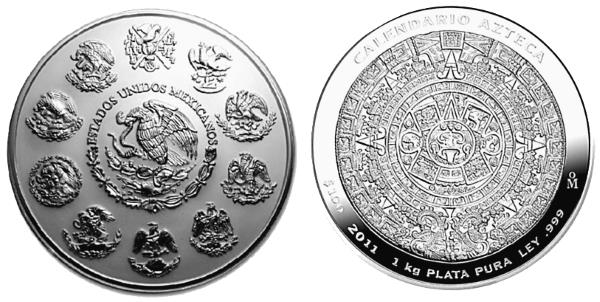 6-е место. В 2010-х годах Национальный банк Мексики несколько раз выпускал инвестиционные монеты, посвящённые древнему ацтекскому календарю. Номинальная стоимость 100 песо, вес 32,15 тройские унции (1000 г), диаметр 110 мм. Изготовлены из серебра 999-й пробы с качеством чеканки «пруф-лайк». Тираж в разные годы составлял от 500 до 1000 экз. Аверс несет на себе центральное изображение мексиканского государственного герба – орла, сидящего на кактусе и терзающего змею. Вокруг расположены 10 предыдущих вариантов герба, использовавшихся в разное время. В центре реверса отчеканен круглый ацтекский календарь из камня, найденный археологами в XVIII веке.