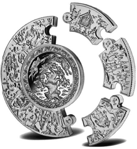 7-е место. Общий номинал 1000 либерийских долларов. Монета-пазл «Русские сказки». Либерия, 2009 год. Золото 999-й пробы, вес драгоценного металла в монете 1000 г. Диаметр центрального кружка 70 мм, диаметр монеты 120 мм. Тираж 50 комплектов. В центре (номинал 300 долларов) – знаменитый пушкинский дуб с Котом Учёным и другими героями из «Руслана и Людмилы». На семи съёмных элементах (номиналы по 100 долларов) – иллюстрации к разным сказкам: избушка Бабы-яги, сама Яга в ступе, богатыри, Иван-царевич с луком и др. Такая же монета-пазл была отчеканена в серебре. И с той же композицией – более мелкие неразборные монеты.