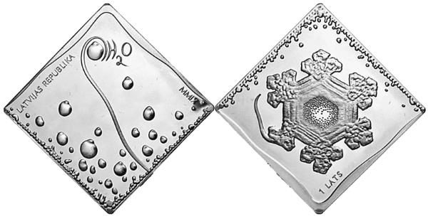 8-е место. Латвия, 1 лат, 2009 год. «Монета воды». Отчеканена из серебра 925 пробы, вес 26,9 г, размер 32 × 32 мм. Тираж 7000 экз. На аверсе изображены капельки воды, на реверсе – ледяной кристалл. Монета в оригинальной форме несёт идею о необходимости сохранения в чистоте природы планеты.