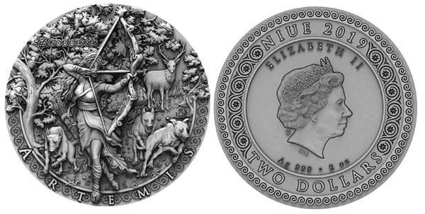 9-е место. Ниуэ, 2 новозеландских доллара, 2019 год. На серебряной монете (проба – 999-я, вес 62,21 г, диаметр 45,0 мм) изображена богиня Артемида. Поразительно высокий рельеф монеты выполнен по технологии «SmartMinting Reloaded», поверхность изделия стилизована под старину (состояние «Antic Finish»). Тираж 500 экз.