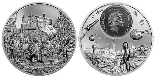 10-е место. Острова Кука, 10 новозеландских долларов, 2021 год. Монета в серии «Прежде и теперь» отчеканена в серебре 999-й пробы, весом 62,20 г, диаметр 45,0 мм. Также применена технология высокого рельефа «SmartMinting Reloaded». На аверсе прекрасное изображение высадки Колумба на Багамах (по картине «Колумб высадился на острове Сан-Сальвадор 12 октября 1492 года», Американская школа, 1893 год). Внизу аверса легенда: «Путешественники жаждут открытий». Реверс представляет исследования будущего. Объявленный тираж монеты – 99 экз.