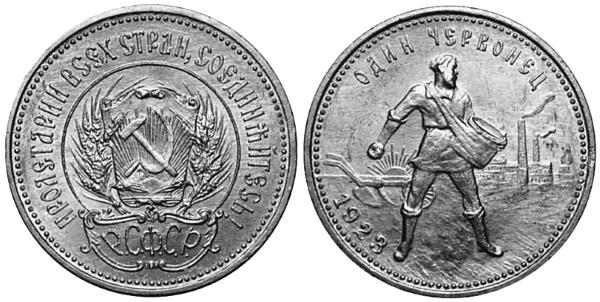 11-е место. Золотой червонец, иногда называемый «Сеятелем», был отчеканен в СССР в 1923 году. Классически-красивая и ныне знаменитая монета из золота 900-й пробы (номинал 1 червонец – 10 рублей, масса 8,603 г, диаметр 22,60 мм). В 1925 году были отчеканены пробные монеты, в 1975–1982 годах новоделы. А в Российской Федерации обращение золотых червонцев возобновлено в 2001 году. Ныне «Сеятель» является одной из четырёх основных инвестиционных монет Банка России (наряду с серебряным «Соболем», серебряным и золотым «Георгием Победоносцем»).
