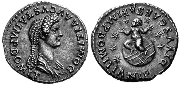 А вот текст легенды на реверсе вызывает вопросы. На оборотной стороне денария отчеканено: «DIVVS CAESAR IMP. DOMITIANI F.», что означает, вероятно: «Божественный цезаря императора Домициана сын» («F.» – традиционное для римской чеканки сокращение слова «FILIVS», «сын»). Изображён сидящий на земном шаре и восторженно распахнувший объятия для всей вселенной голенький младенец в окружении семи звёзд. Мне скажут, что логичнее перевести текст на реверсе как «Божественного цезаря императора Домициана сын». Это действительно больше подходит по строению фразы. Если бы не одно «но»: титул «Divus» («Божественный») чаще всего применялся к умершему обожествленному императору. Но ведь сам Домициан в в 82–83 годах был жив и здоров. А вот единственный сын его и Домиции Лонгины умер в очень раннем возрасте.