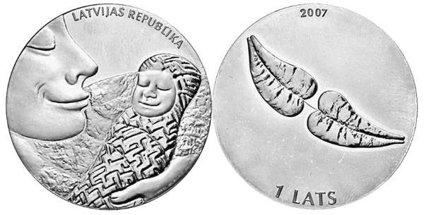 Радостью, счастьем и нежностью веет от монеты Латвии 2007 года номиналом 1 лат. Называется это нумизматическое чудо «Монета жизни». Серебро 925-й пробы, вес 31,47 г, диаметр 38,61 мм, дизайнер И. Блумбергс, гравёр Л. Францкевич, изготовлена Парижским монетным двором (Monnaie de Paris, Пессак, Франция). На аверсе изображена мать, бережно обнимающая ребенка в золотых пеленах. Реверс представляет два золотых листа в форме сердец, соединённых неразрывной серебряной линией.