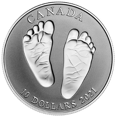 С такими же эмоциями можно воспринимать серебряную монету Канады 2013 года нарицательной стоимостью 3 доллара. Она представляет чудесную картинку: отец, сын и пёсик, все трое одинаково увлечённые, сидят на мостике, наблюдая за удочкой (серебро 999-й пробы, вес 7,96 г, диаметр 27 мм). «Дарите нашу монету вашим папам в третье воскресенье июня на День отца», – советуют издатели. Но последовать совету не так просто, немаленький тираж в 15 тысяч экземпляров уже давно разошёлся. А вот другая нежная монета Канады вполне доступна, правда, в повторных выпусках. Королевский монетный двор этой страны в течение всех 2010-х годов регулярно переиздаёт монету номиналом 10 долларов «Добро пожаловать в этот мир!» (серебро 999,9-й пробы, вес в среднем 15,8 г, диаметр 34 мм). На реверсе дизайнеры размещают трогательное чудо: отпечатки ножек младенца.