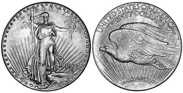 Двадцать долларов «Двойной орёл». США, 1933 г. Золото (33,4 г, 34 мм). Аукцион «Sothebyʼs», Нью-Йорк, 2021 г. $ 18 900 000