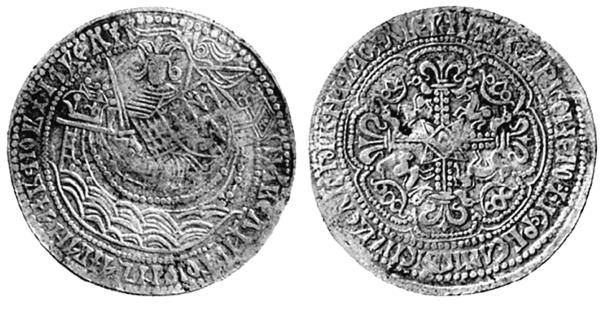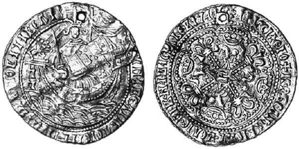 Со времени правления Ивана III Васильевича (1440–1505, княжил с 1462 года) до нас дошли золотые монеты Московской Руси. Это золотой дукат, сработанный наподобие уже существовавшего к тому времени венгерского аналога и потому названный «угорским» (уникум также хранится в эрмитажной коллекции). И корабельник (корабленник), скопированный с английского нобля Эдуарда III (о происхождении нобля коротко сказано в главе «Двойной леопард»). Русское название нобля, перешедшее и на монету Московской Руси, происходит от сюжета на аверсе монет: государь с мечом и щитом плывёт на корабле.