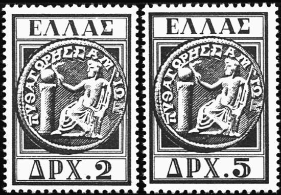 Вот так и Пифагор: на одних прорисовках «весёлый», на других – «хмурый». Пожалуй, первой в ряды «рисовальщиков» встало почтовое ведомство Греции. В 1955 году в этой стране была издана очень интересная серия марок, посвящённая Пифагору. Миниатюра номиналом 6 драхм представляет карту острова Самос, где родился и жил учёный. Марка в 3,50 драхмы наглядно иллюстрирует знаменитую теорему, показывая квадраты, примыкающие к гипотенузе и к катетам прямоугольного треугольника. А на марках в 2 и 5 драхм – прорисовка монеты с изображением Пифагора Самосского. Вся серия сейчас довольно редка, поскольку при миллионных тиражах номиналов 2, 3,50 и 5 драхм, «концовка» в 6 драхм с картой была отпечатана всего в 97 тысячах экземпляров. Конечно, художники марок порой сильно фантазируют, изображая монеты. Но в данном случае создатель серии, скорее всего, имел перед глазами оригинал в металле.