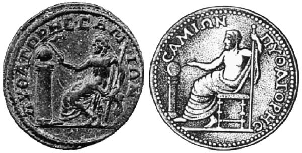 Беда в том, что с монетами-то, будто с датами жизни Пифагора, такая же неразбериха. Все знают и многократно переписывают друг у друга информацию о том, что первые монеты с изображением Пифагора чеканились на его родине в Самосе то ли при императоре Траяне (53—117 н. э.), то ли во время совместного правления Валериана (193/200—260 н. э.) и сына его Галлиена (218–268 н. э.).