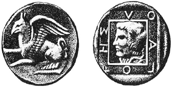 Нет никакой уверенности, правильно ли нарисована монета и точно ли воспроизведена легенда на ней. Во всяком случае, следов магистрата в таком написании «VOAГOPHΣ» (да простит мне г-н учитель Пифагор мою нерадивость) я обнаружить, как и саму монету, не смог. Может быть, плохо искал, а может быть, вот так непонятно и искажённо нарисовали… Да, кстати, имена других реальных магистратов куда больше смахивают на пифагорское, чего бы сочинителям не взять в своё время их за основу? Мольпагорес, например (обнаружился в Абдере в 386–375 годах до н. э.): «МОЛПАГОРНΣ»; или тем более похожий по написанию Герагорес (411–385 до н. э.): «НРАГОРНΣ»…
