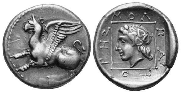 Абдеры. Фракия. Магистратские имена на серебряных монетах: МОΛПАГОРНΣ. Тетробол, 386–375 гг. до н. э. Аукцион «Roma Numismatics», Лондон, 2016 г.; НРАΓОРНΣ. Статер, 411–385 гг. до н. э. (www.wildwinds.com)