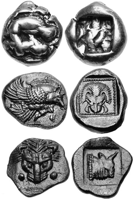 Единственный вопрос, который не вызывает споров: а какие монеты могли быть в руках Пифагора? Здесь абсолютно ясно. С удовольствием показываю появившуюся на недавних аукционах чеканку Самоса, подходящую по годам выпуска: статер из электра (самородное золото, сплав с серебром), 11 мм, вес 2,85 г., около 600–570 годов до н. э., в 2013 году ушёл с молотка за 1200 американских долларов; серебряная драхма (13 мм, 3,06 г), около 510–500 годов до н. э., продана в том же году за 800 долларов; серебряный гемиобол, то есть 1/2 обола (8 мм, 0,33 г), около 500–494 годов до н. э., реализован в 2013 году за 240 долларов.