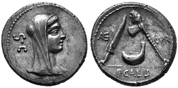 Вот такая довольно забавная история, подтверждающая, что в нумизматике, как и в любой науке, торопиться с выводами не стоит. Кстати, о монете того самого Публия. Это серебряный денарий весом 3,90 г. На аверсе изображена богиня священного вечного огня Веста, а на реверсе – атрибуты для жертвоприношений в её честь: церемониальные нож и секира и сосуд для жертвенных возлияний вина (а никак не для крови невинных жертв!).