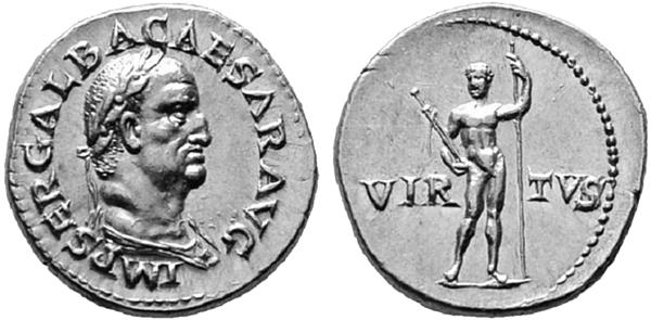 Но, что самое интересное, и на это мало кто обращал внимание – а ведь и Сервий Сульпиций Гальба, будучи императором, выпустил монету с изображением древнеримского короткого меча и копья, правда, это лишь дополнительные элементы сюжета. Держит их на реверсе ауреуса 68–69 годов н. э. некий молодой римский мужчина. Образ обобщённый – тем и интересен: не желанием ли напомнить о судьбе тирана Нерона и о роли в этой истории самого Гальбы (он на аверсе) был обусловлен выбор символического изображения? Тем более что надпись на реверсе «VIRTVS» означает «доблесть» и «добродетель» – прозрачный намёк на поступок нового императора, избавившего империю от тирана. Сия золотая монета по праву занимает место в перечне великих. Поддерживает её там не только историческая канва событий, при которых была отчеканена. Но и реальная редкость: в 2016 году ауреус был продан на аукционе за 340 тысяч долларов США.