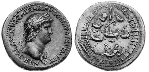 Вот сестерций, датируемый 64 годом, из латуни (аурихалка). На аверсе профиль начавшего стремительно полнеть императора, а на реверсе – вид с высоты птичьего полета на гавань в Остии, это морской порт внутреннего города Рима. В гавани корабли, сверху сюжет увенчан статуей Нептуна, это маяк. А внизу расположился бог реки Тибр, держащий в руках руль и дельфина. Такая вот мирная картинка, заканчивающаяся справа серповидным рядом волноломов или стапелей с фигуркой сидящей нимфы. Ещё при Клавдии начались работы над второй гаванью в этом месте, которую и завершил Нерон. Эта величественная вторая гавань в северных устьях Тибра была известна своим фаросом (маяком) с Нептуном, который построен на фундаменте, созданном после затопления одной из ненавистных прогулочных барж Калигулы и заполнения её бетоном.