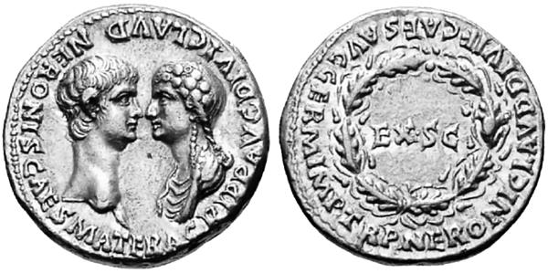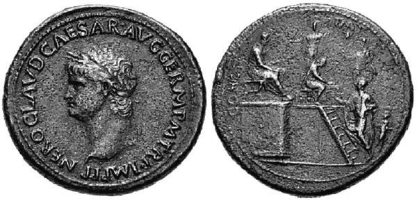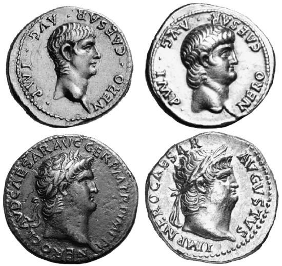 Впервые Нерон появился на серебряном денарии императора Клавдия в 50 году. На аверсе этой монеты сам Клавдий, на реверсе – приёмный сынуля, худощавый и с виду добродушный мальчик. Слишком много «неронов» Клавдий начеканить не успел: в 54 году, как единодушно сообщается во многих источниках, любящая супруга нажарила ему грибочков, тот откушал – ну и вот!.. Последующие 14 лет правления Нерона заслуженно закрепили за ним славу чудовища и исчадия ада. Но, как я уже отмечал, на монетах всё благопристойно.