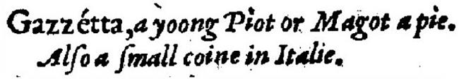 До него в 1598 году Джон Флорио (1553–1625) выпустил итальянско-английский словарь «A World of Words» (дополнен в 1611 году). Здесь словом gazzette названы «текущие отчёты, ежедневные новости, праздные рассуждения или пустые сказки, которые ежедневно пишутся из Италии, а именно из Рима и Венеции». А итальянское уменьшительное «gazzettа» (от слова gazza – «сорока»; то есть птица, являющаяся символом болтовни и трескотни) рассматривается Джоном Флорио как нечто незначительное, «типичное для сплетен» и как раз связанное и с газетой, и с монетой.