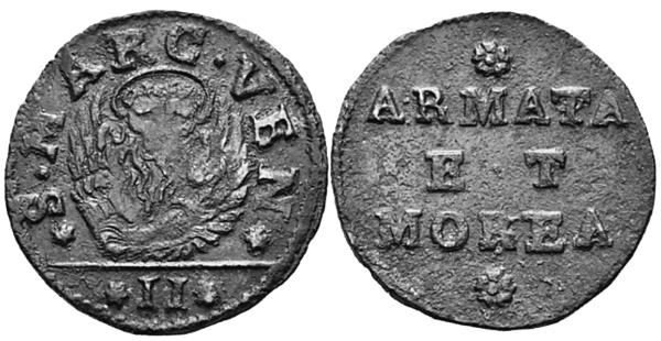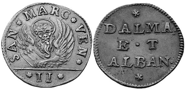 На иллюстрациях показываю две монеты с номиналами 2 сольдо – одна выпущена для вецецианских Далмации и Албании (конец XVII века), другая – для Мореи (то есть для полуострова Пелопоннес) и расположенных там воинских формирований Армата (отчеканена при 108-м венецианском доже Франческо Морозини в 1688–1694 годах). Эта территориальная принадлежность обеих монет указана на реверсах. А на аверсах читаем легенду: «SAN. MARC. VEN. II» и «S. MARC. VEN. II», где «II» – тот самый номинал в сольдо. Остальные слова легко понять: «Святой Марк Венеция». Как известно, Лев святого Марка является символом евангелиста Марка и самого города Венеции. Здесь с 828 года хранились святые мощи этого евангелиста, которые были тайно вывезены из занятой мусульманами Александрии. Вот именно к этим монетам и к другим того же номинала, отчеканенным в более ранние годы, и прилипло прозвище gazzetta из-за того, что так называлось «подведомственное им» периодическое издание.